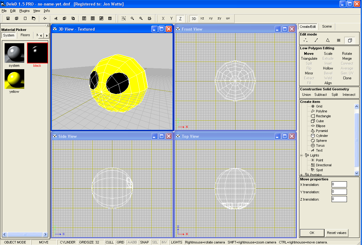 The task is to put black eyes on a yellow, round sphere. I've started by creating the yellow sphere, and two black cylinders where the eyes should be.