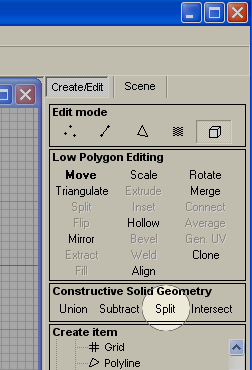 Now, select first the left cylinder (with shift-click in the overhead view), and then the sphere (with control-shift-click) so they're both selected, the sphere being second. Order counts, as the "operand" will be the second thing selected. Press the "Split" button: